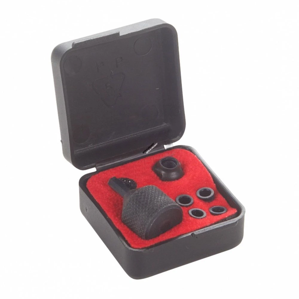 - 4 inserts: .8 mm (1/32″) 1.2 mm (3/64″) 1.4 mm (1/16″) 2.2 mm (3/32″)