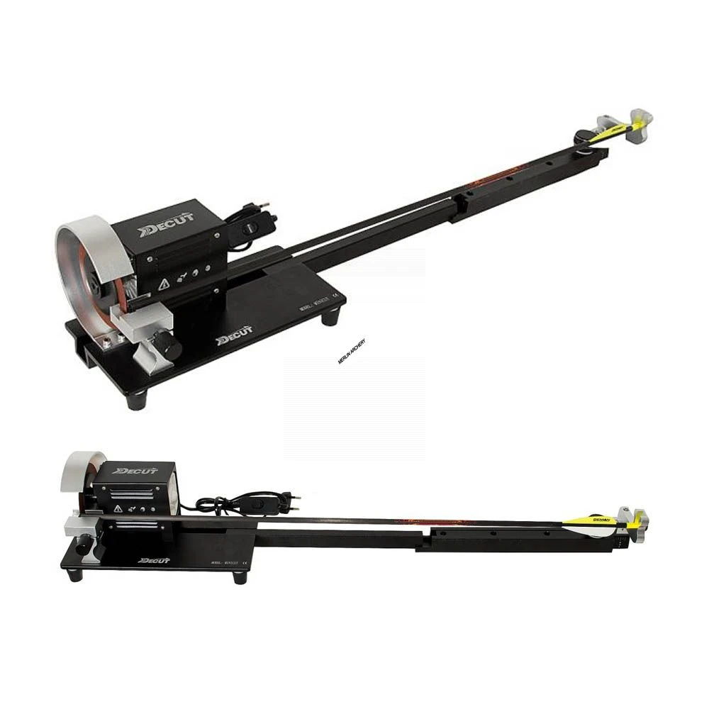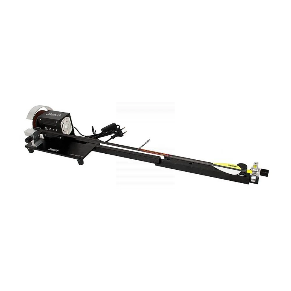 Compact arrow cutting machine with extending arrow length plate and finger guard for safety.