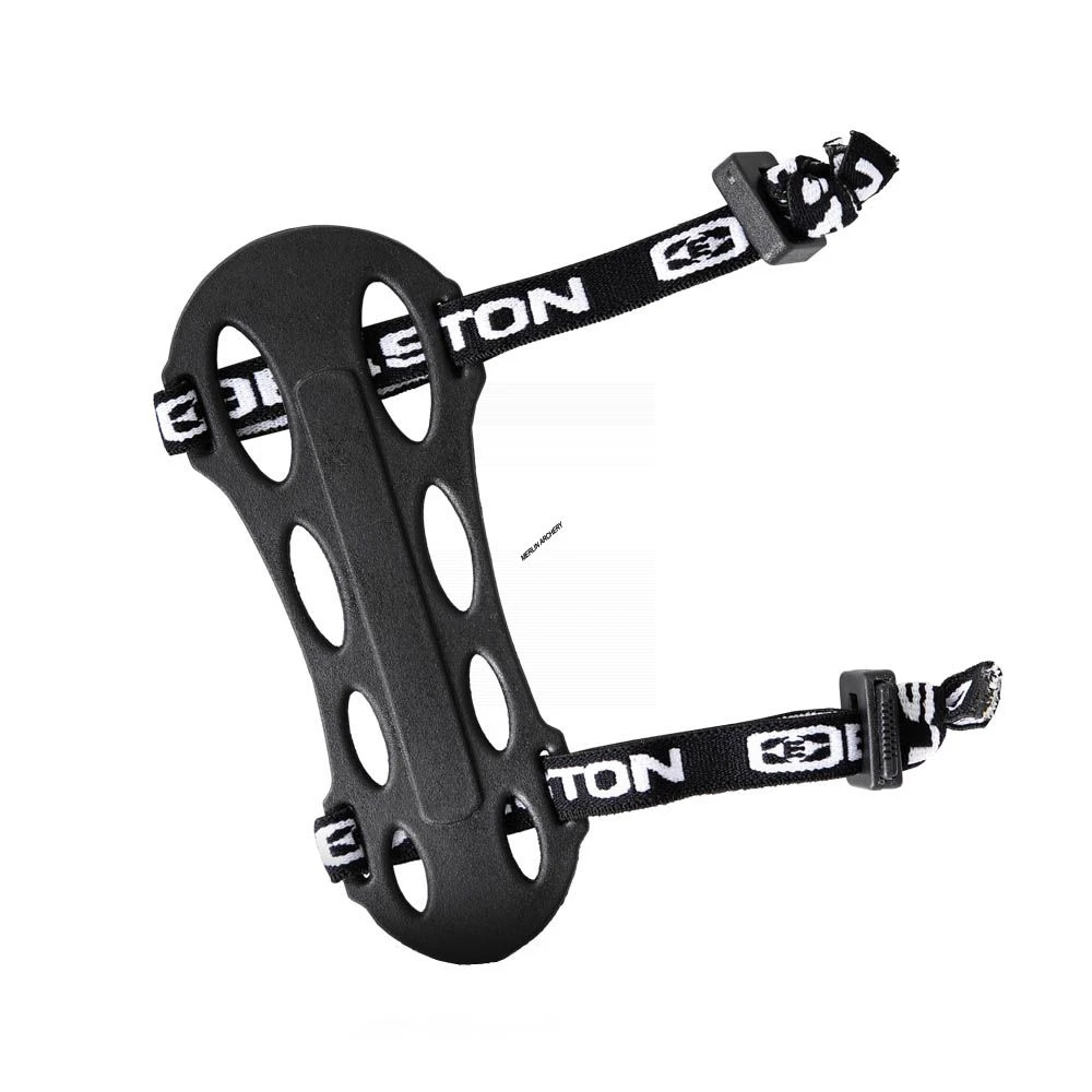 Flexible moulded composite arm guard with elastic straps and adjustable cord locks.